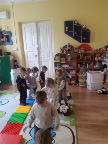 • poznają wzorce ruchowe i uczą się schematu własnego ciała, • ćwiczą utrzymanie równowagi i koordynację ruchów, • trenują orientację ciała w przestrzeni – kluczową dla dalszego rozwoju poznawczego i społecznego.