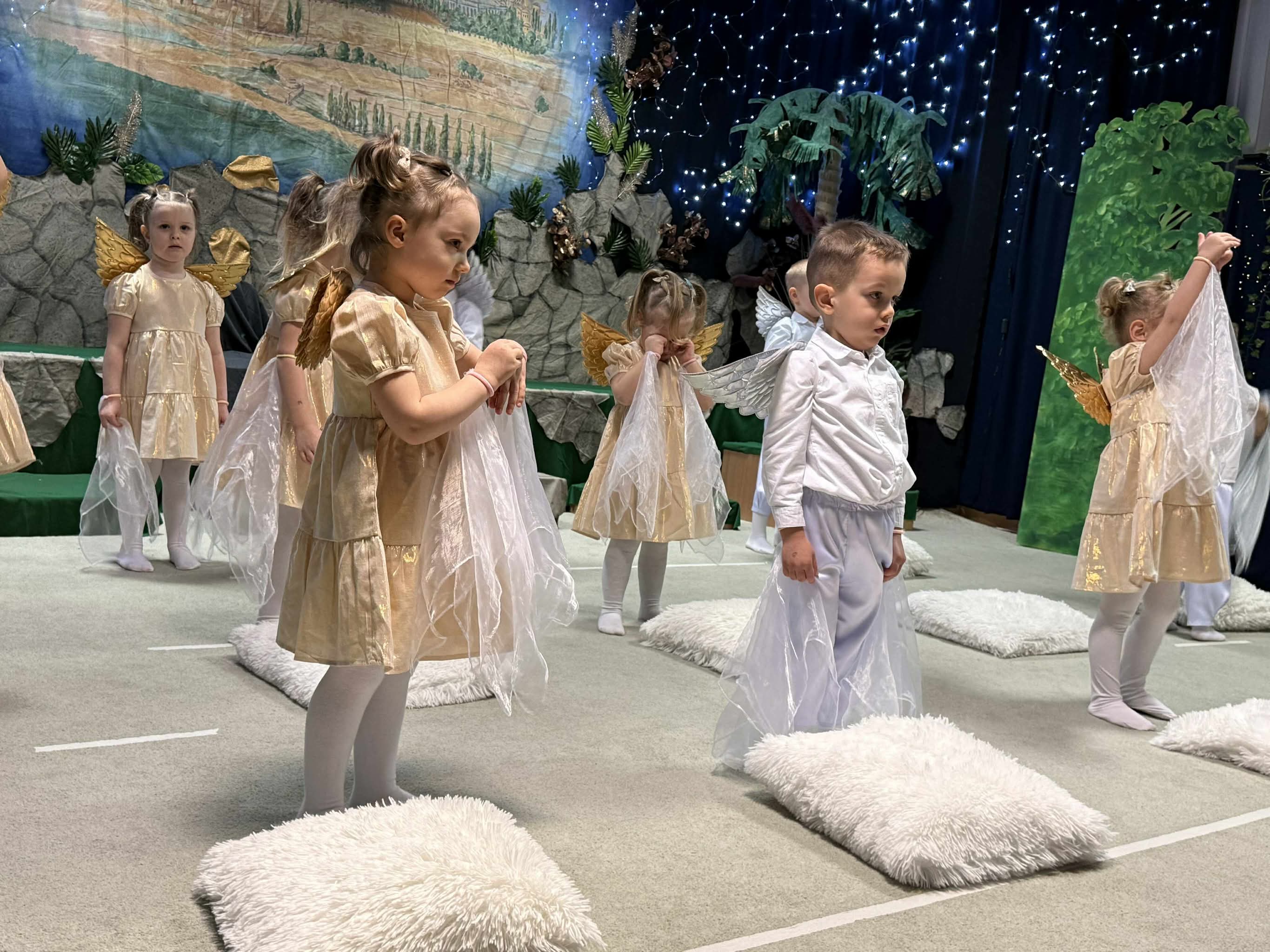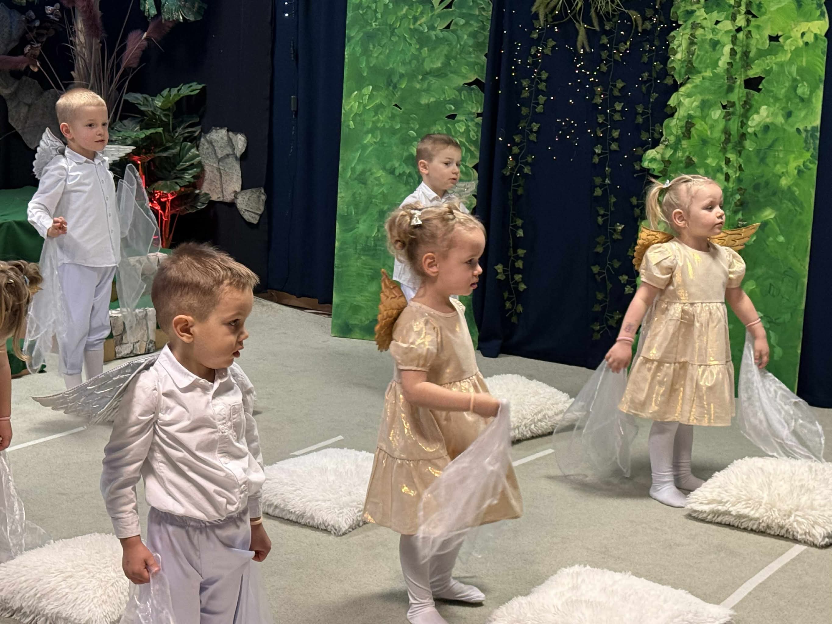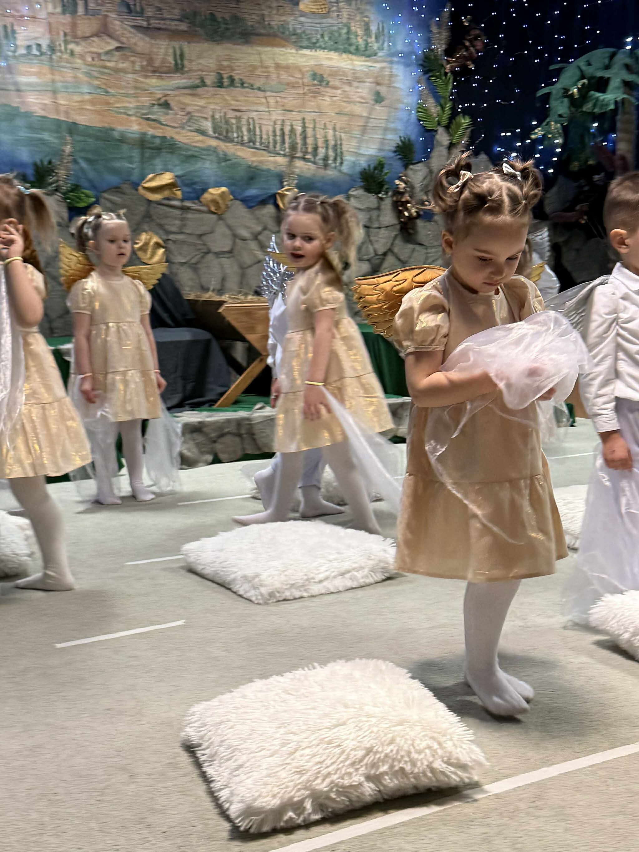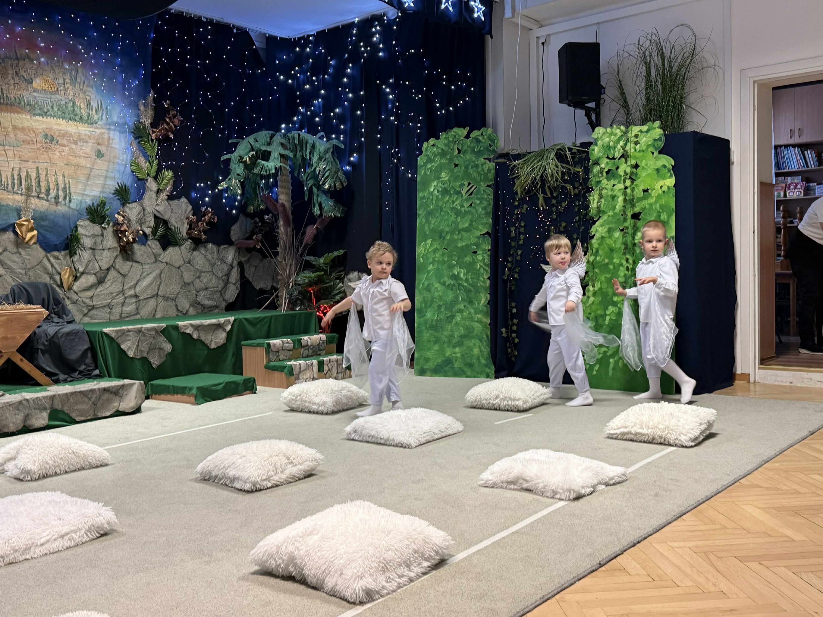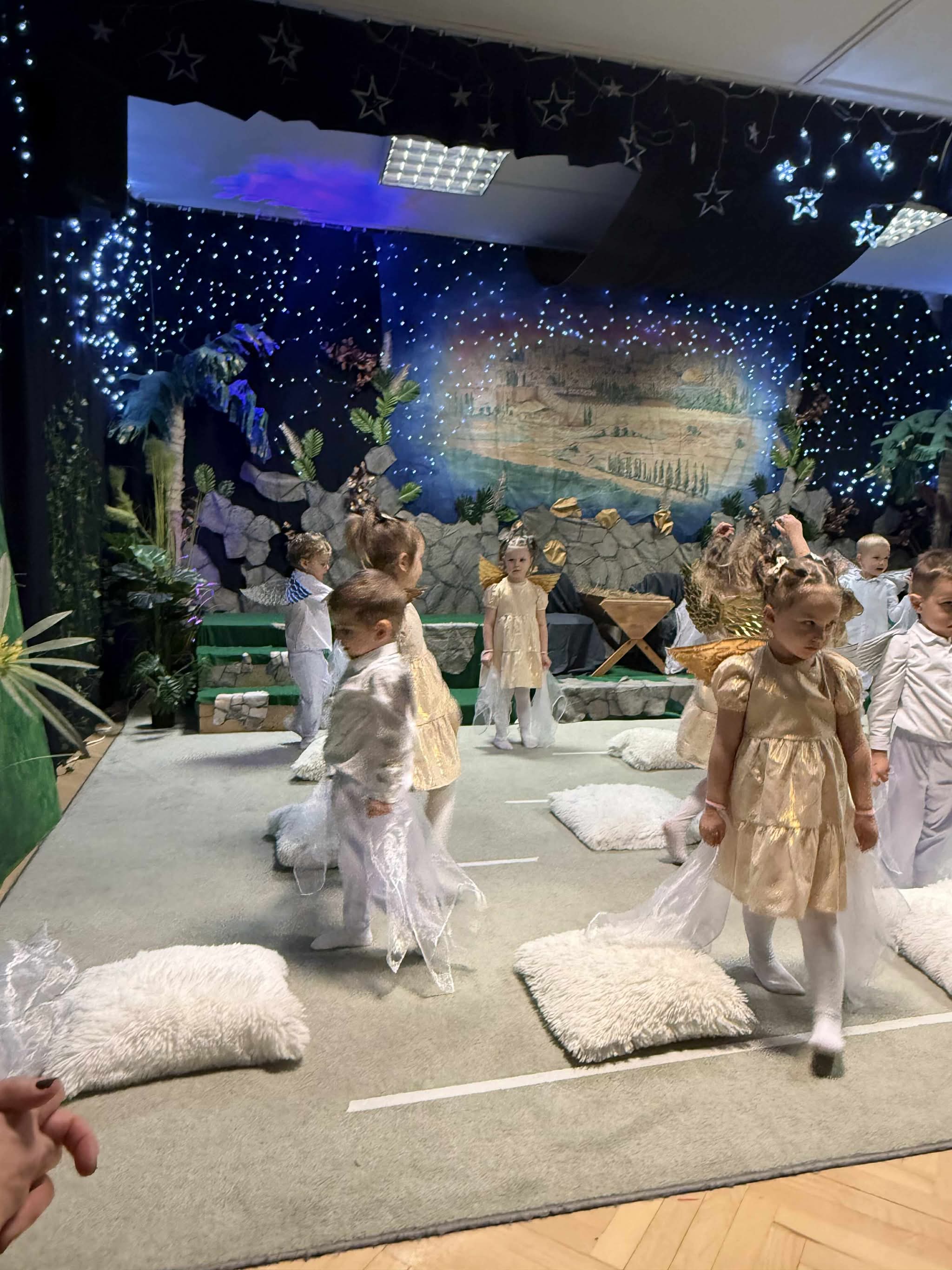 W czas Bożego Narodzenia, najmłodsza grupa Krasnali z naszego przedszkola przygotowała wyjątkowe jasełkowe przedstawienie pod tytułem „W Aniołkowie”. Trzyletnie maluszki z ogromnym zaangażowaniem i dziecięcą szczerością opowiedziały historię narodzin Pana Jezusa, wprowadzając wszystkich zgromadzonych w świąteczny nastrój pełen radości i ciepła.