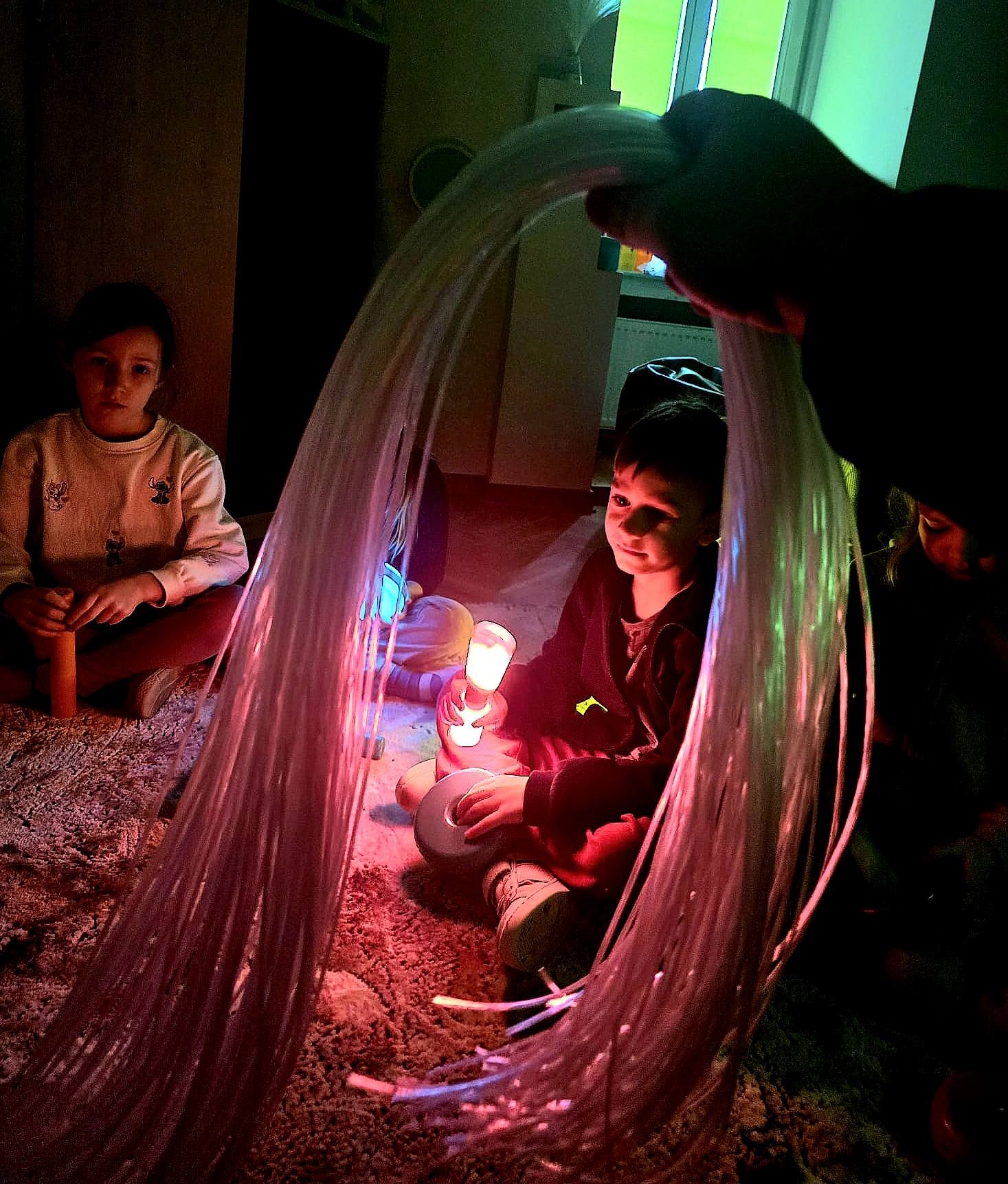 Nasza sala została wyposażona w różnorodne i atrakcyjne pomoce dydaktyczne, które zachęcają dzieci do odkrywania i eksperymentowania zmysłami. Znajdują się tu miękkie maty, kolorowe światła, delikatne dźwięki oraz różnorodne materiały do dotykania i manipulowania. Wszystko to ma na celu stymulowanie zmysłu wzroku, słuchu oraz dotyku, a także rozwijanie motoryki małej i dużej.