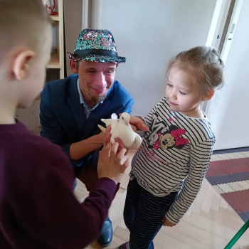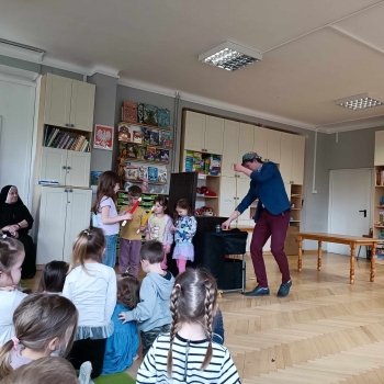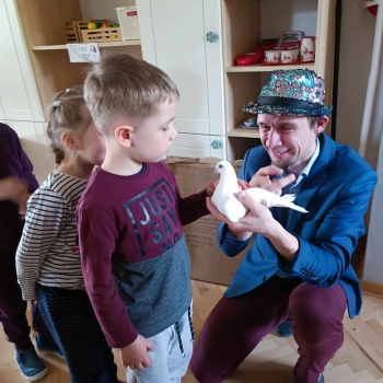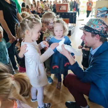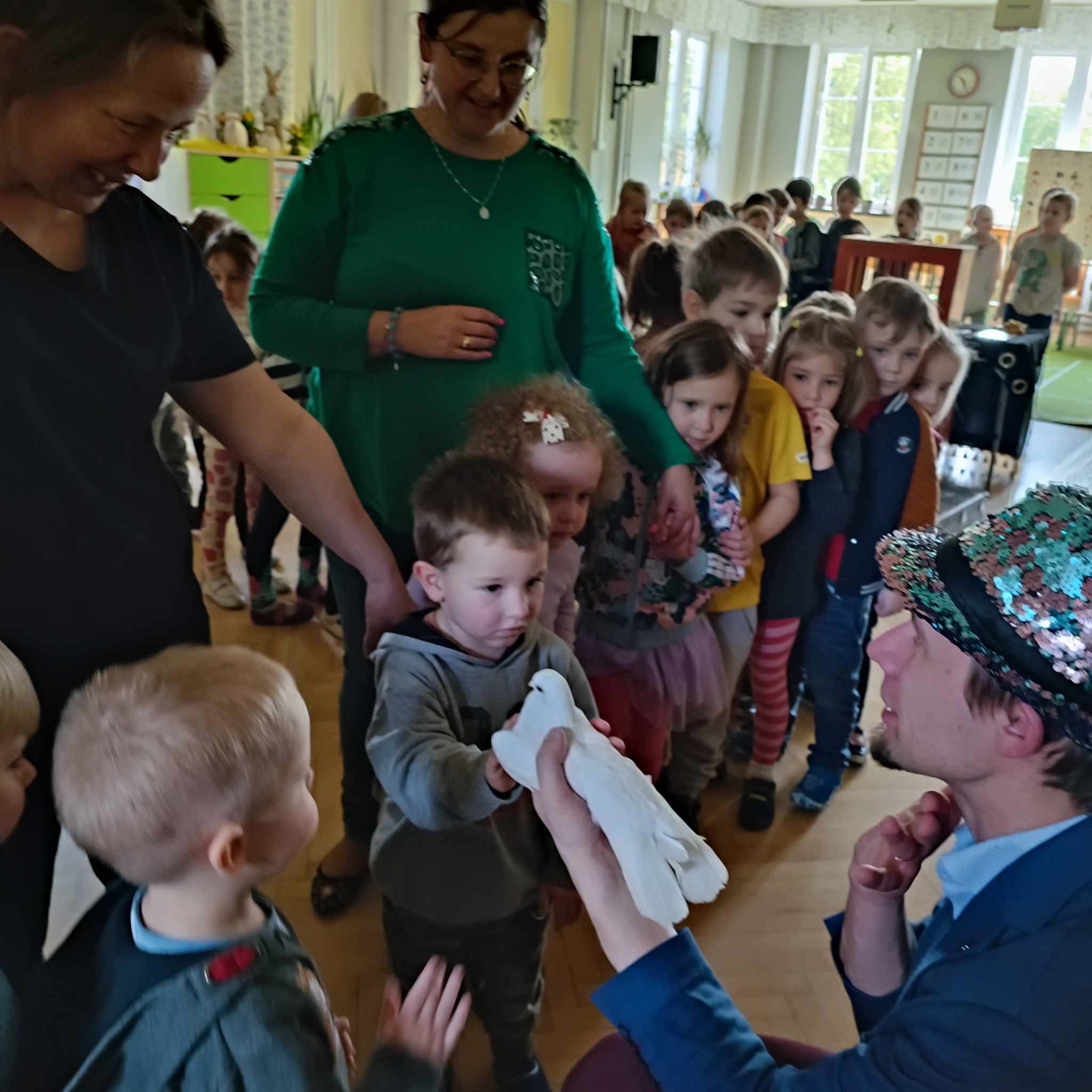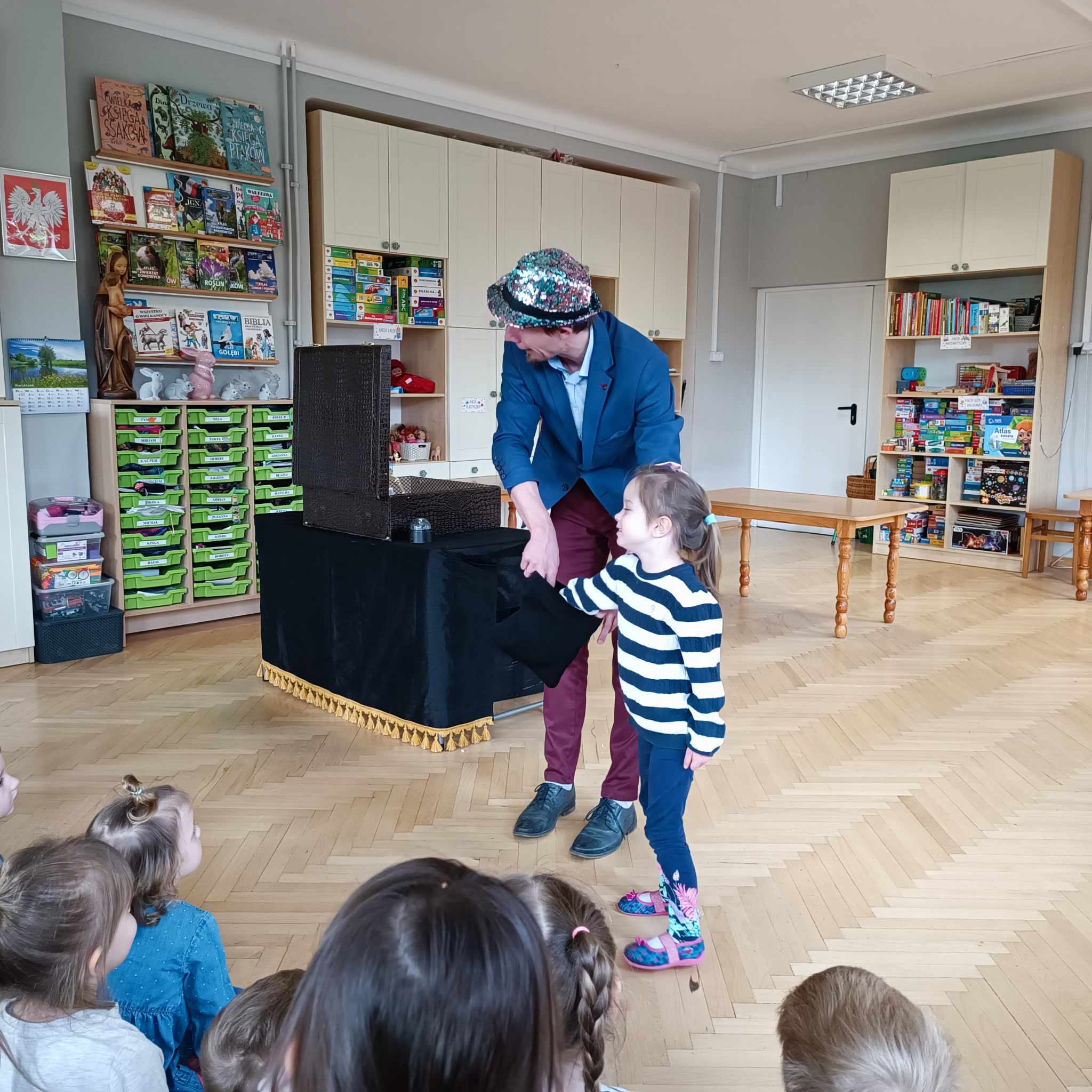 Dzisiejszy dzień okazał się magicznym dniem dla naszych przedszkolaków. Odwiedził nas w tym dniu Iluzjonistą, który dzięki swoim umiejętnościom, zabrał dzieci do świata iluzji, humoru i dobrej rozrywki. Magiczne sztuczki wywoływały na twarzach przedszkolnej publiczności zaciekawienie, a nawet zachwyt. W znany tylko magikowi sposób pojawiały się i znikały przedmioty: kolorowe piłki itd. Dzieci dzielnie towarzyszyły magikowi, a niektóre z nich były też asystentami w magicznych sztuczkach. Głośne brawa i śmiech były wyrazem uznania dla popisów niecodziennego gościa.